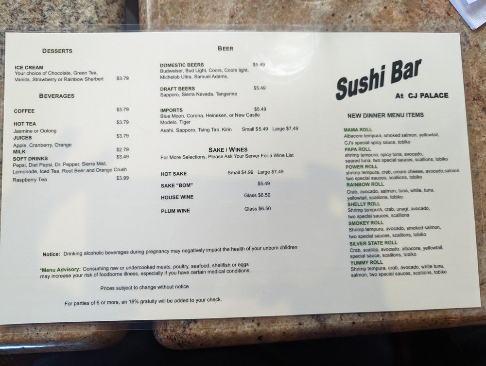 CJ Palace is a Japanese and Chinese fusion restaurant located at 129 Los Altos Pkwy Ste 119 in Sparks, NV. They offer a wide range of dishes with many vegetarian options and cater to various dietary needs. The restaurant is casual and wheelchair accessible, with ample parking and waiter service available. Their menu includes appetizers like Barbequed Pork and Fried Prawns, as well as Family Dinner Combination Specials for two people. For soups and salads, they offer Chicken Salad and Egg Flower Soup in different sizes. CJ Palace truly embodies the essence of Asian cuisine, delivering flavorful and satisfying meals in a welcoming atmosphere. The diverse menu and welcoming ambiance make it a great spot for lunch or dinner with friends and family.